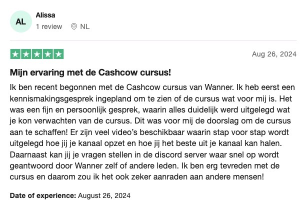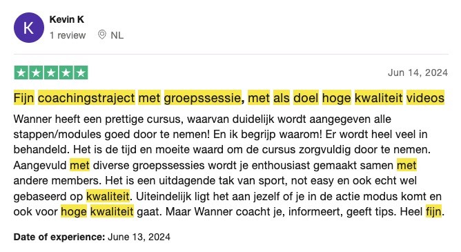 Wanner heeft een prettige cursus, waarvan duidelijk wordt aangegeven alle stappen/modules goed door te nemen! En ik begrijp waarom! Er wordt heel veel in behandeld. Het is de tijd en moeite waard om de cursus zorgvuldig door te nemen. Aangevuld met diverse groepssessies wordt je enthousiast gemaakt samen met andere members. Het is een uitdagende tak van sport, not easy en ook echt wel gebaseerd op kwaliteit. Uiteindelijk ligt het aan jezelf of je in de actie modus komt en ook voor hoge kwaliteit gaat. Maar Wanner coacht je, informeert, geeft tips. Heel fijn.