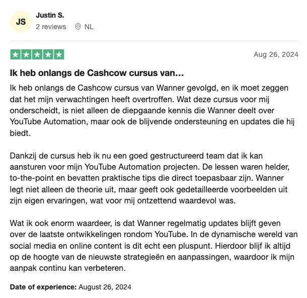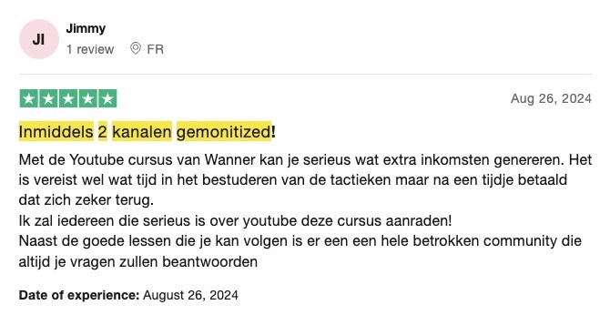 De cursus die Wanner aanbiedt is educatief. Zeer uitgebreid. Grote hoeveelheid video’s met veel details, dus erg waardevol. Veel handige tips. De online groepssessies met Wanner zijn ook erg waardevol, waar hij ingaat op trends en actualiteiten rondom YouTube. Plus vragen beantwoordt van studenten. Naast dit is Wanner erg down to earth, charismatisch. En wil hij echt de studenten helpen. Iedereen die nog nooit een YouTube kanaal heeft gehad kan het beste eerst een coaching aanvragen bij hem. Want kans van slagen is dan zeker een realiteit!!!!