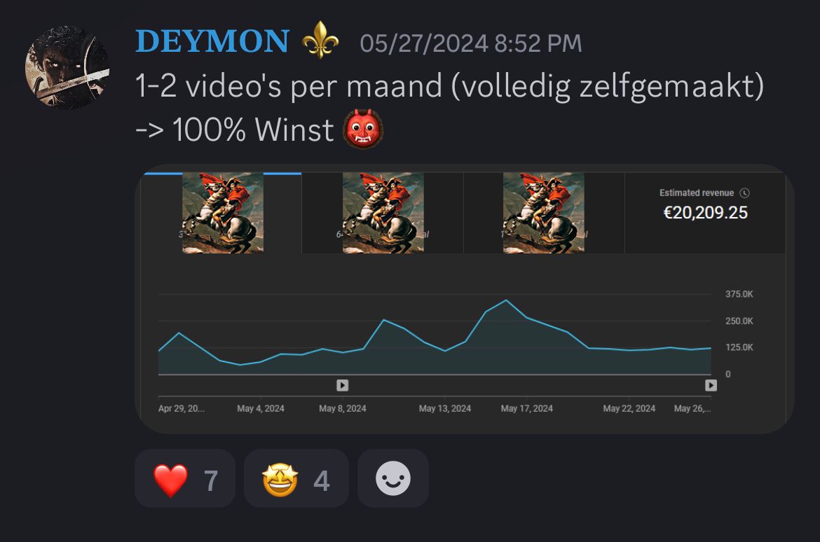 Nadat alles up en running was ging het erg snel. Eerste videos allemaal laten maken en uiteraard laten controleren door mijn coaches. Door de duidelijke tips weet ik nu precies waar ik op moet letten. Na 2 weken was ik monetized en 3 weken na monetization winstgevend!! Nu door blijven bouwen.