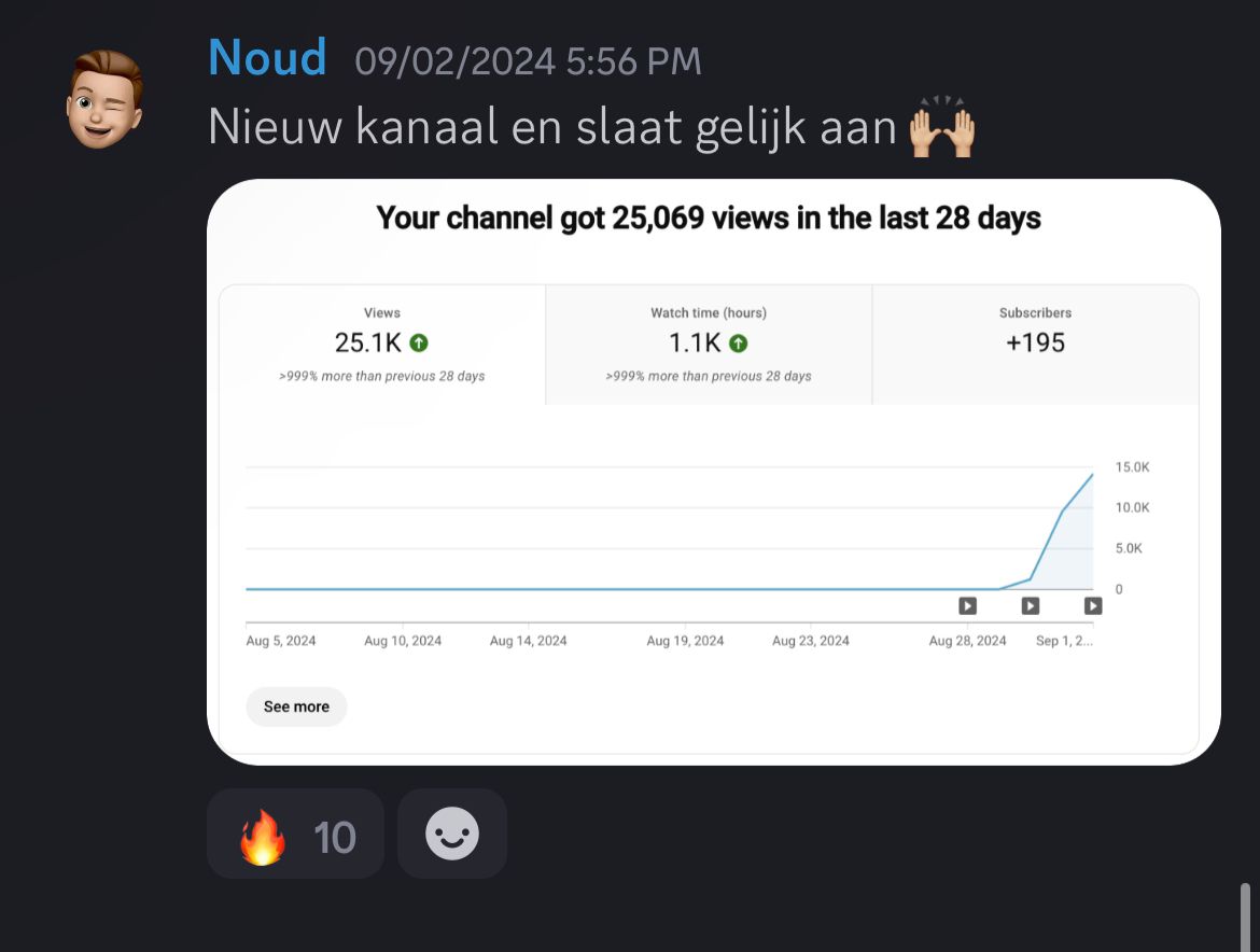 Het programma van Wanneer heeft mij geholpen om te kunnen starten met YouTube. Na 2 maanden behaalde ik al mijn eerste resultaten. Wanner heeft ontzettend veel kennis en voor vragen is hij altijd goed te bereiken. Zou dit programma zeker aanraden aan anderen die twijfelen om te starten met YouTube.